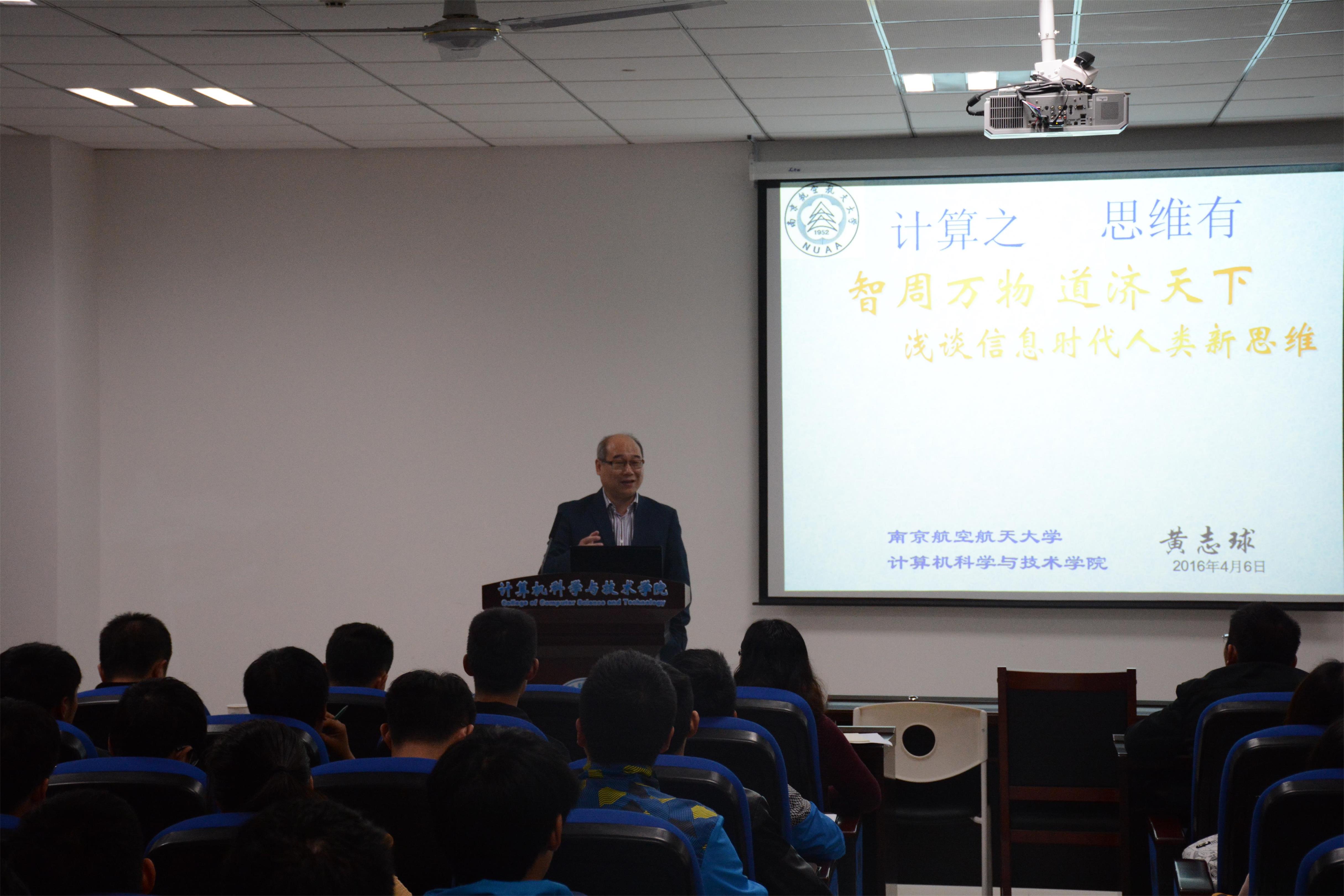 启动视频之后,陈兵向同学们简要介绍了开展活动的初衷、意义、拟开展的形式和后续计划等。黄志球将计算思维与校训融合在一起,从“计算之智周万物”、“睿智慧眼识真知”、“思维有道济天下”、“术道合一创未来”四个层面出发,层层递进、深入浅出,在“如何用计算思维来探索软件世界”中,开启对同学们的导航之旅。讲座中,黄志球用生动的事例告诉同学们计算思维在影视、音乐、绘画等方面如何体现,他将计算机科学总结为以计算思维为基础,以科学的思维、工程的方法,创造虚拟新世界。黄志球还与现场学生进行了互动交流,对同学们提出的“如何在平时学习中培养计算思维”、“如何进一步提升专业兴趣”等问题一一作答,他希望同学们在低年级夯实专业基础,在高年级勇于创新实践,用计算思维开创自己的美好未来。