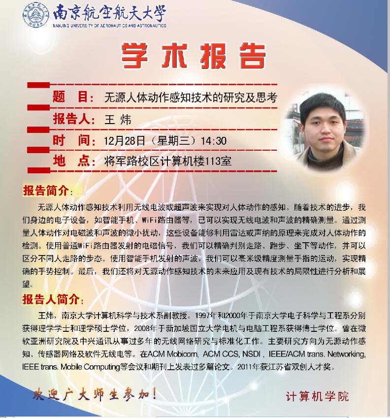 【学术报告】南京大学副教授王炜:无源人体动作感知技术的研究及思考