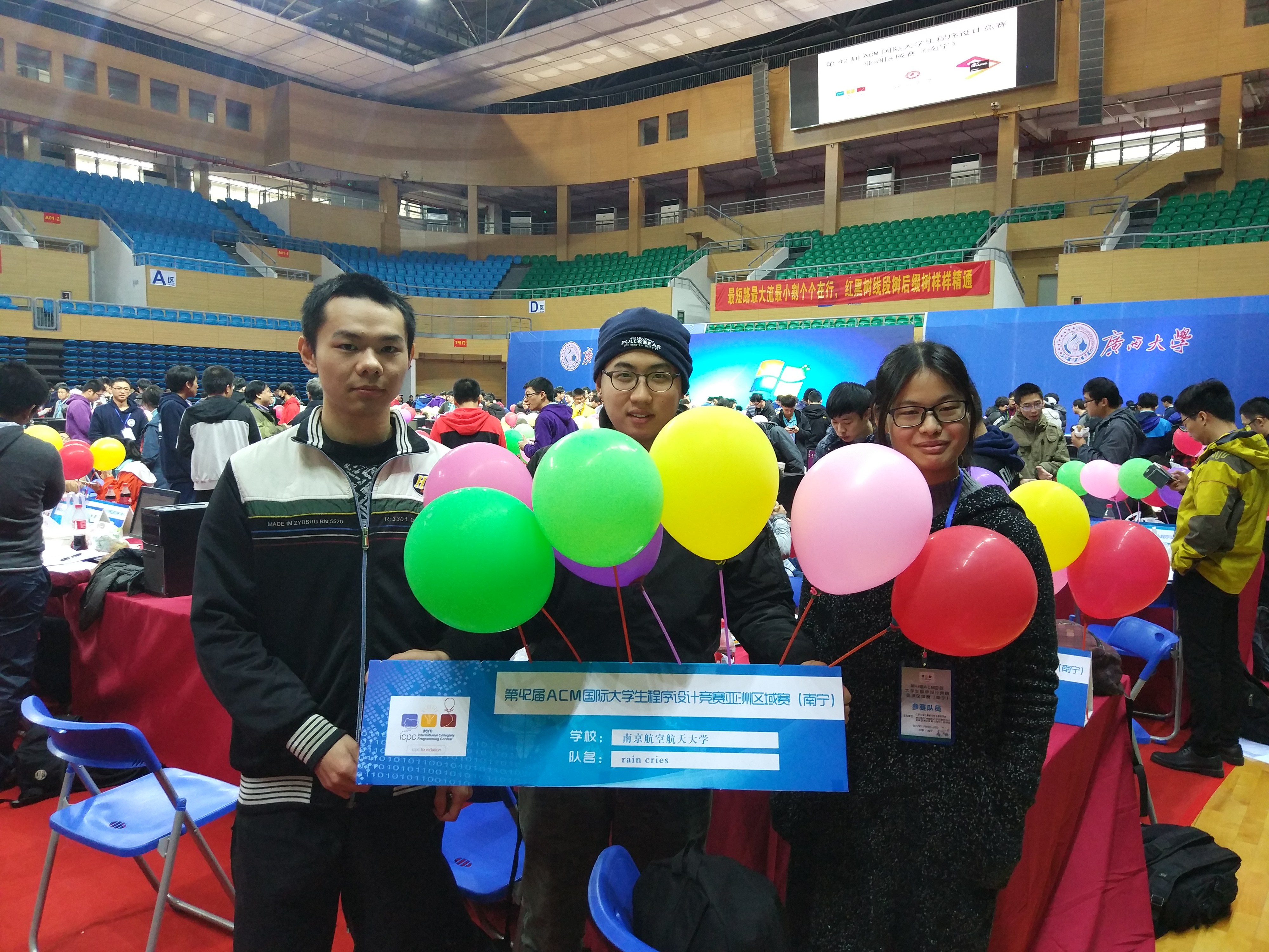 2017年11月26日,ACM-ICPC国际大学生程序设计竞赛亚洲区域赛南宁站的比赛在广西大学隆重举行,我校44118太阳成城集团14级学生高景胜、16级学生毛心怡和高天佑组成的团队以优异的发挥从228支入围现场赛的队伍中脱颖而出,夺得亚洲区域赛金奖。这是我校第三次获得该项赛事金奖。由计算机学院15级学生黄振、黄聿超、王天行组成的另一支队伍获得大赛银奖。