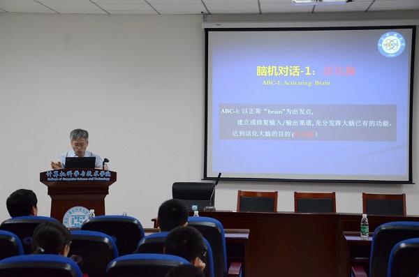 会议上半场,与会嘉宾带来了精彩的学术报告。尧德中教授首先做题为“脑机对话及其应用”的学术报告,报告中脑机对话是指大脑与脑外人体器官以及人体以外环境之间的信息交流,相关研究涉及大脑功能作用的正常发挥、异常大脑功能的干预与矫正以及脑功能的维护与增强。报告结合实例,较详细的介绍脑机对话的概念和分类,探讨相关技术在多个方面的应用现状和前景。最后介绍了团队在脑波音乐技术及应用、视频动作游戏及应用、脑控机器人及应用等方面的研究进展;刘连庆研究员带来题为“生命和机电的融合:类生命机器人”的学术报告,报告提出类生命机器人的研究理念,通过生命系统和机电系统在分子和细胞尺度的融合,推动机器人系统由非生命介质向生命介质转变,使得机器人同时具备生命系统和机电系统的优点,进而提升机器人的各种性能、带动机器人学科的发展。报告还以感知、驱动和智能为例,介绍如何以活体细胞为物质载体,通过与机电系统的结合,实现生命本征感知、驱动和智能,演示出类生命机器人理念的先进性和效果。俞祝良教授与大家分享了题为“机器学习在脑机交互中的应用研究”的专题报告,机器学习技术在脑机交互中扮演重要的角色,深度学习可以从数据中自动学习发现特征,为多模态脑机交互中的功能数据分析提供了一个非常好的手段。报告基于团队的最新研究成果,介绍如何通过构建适当深度的网络,结合对于处理问题的理解和建模,利用机器学习技术显著提升脑源定位和事件相关电位分析的性能。