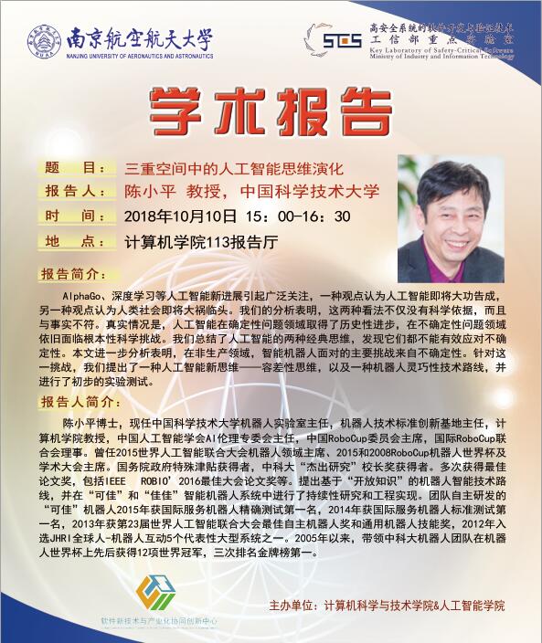 【学术报告】陈小平 教授:三重空间中的人工智能思维演化