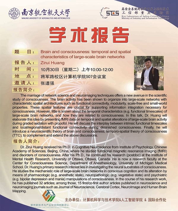 【学术报告】Zirui Huang:Brain and consciousness: temporal and spatial characteristics of large-scale brain networks