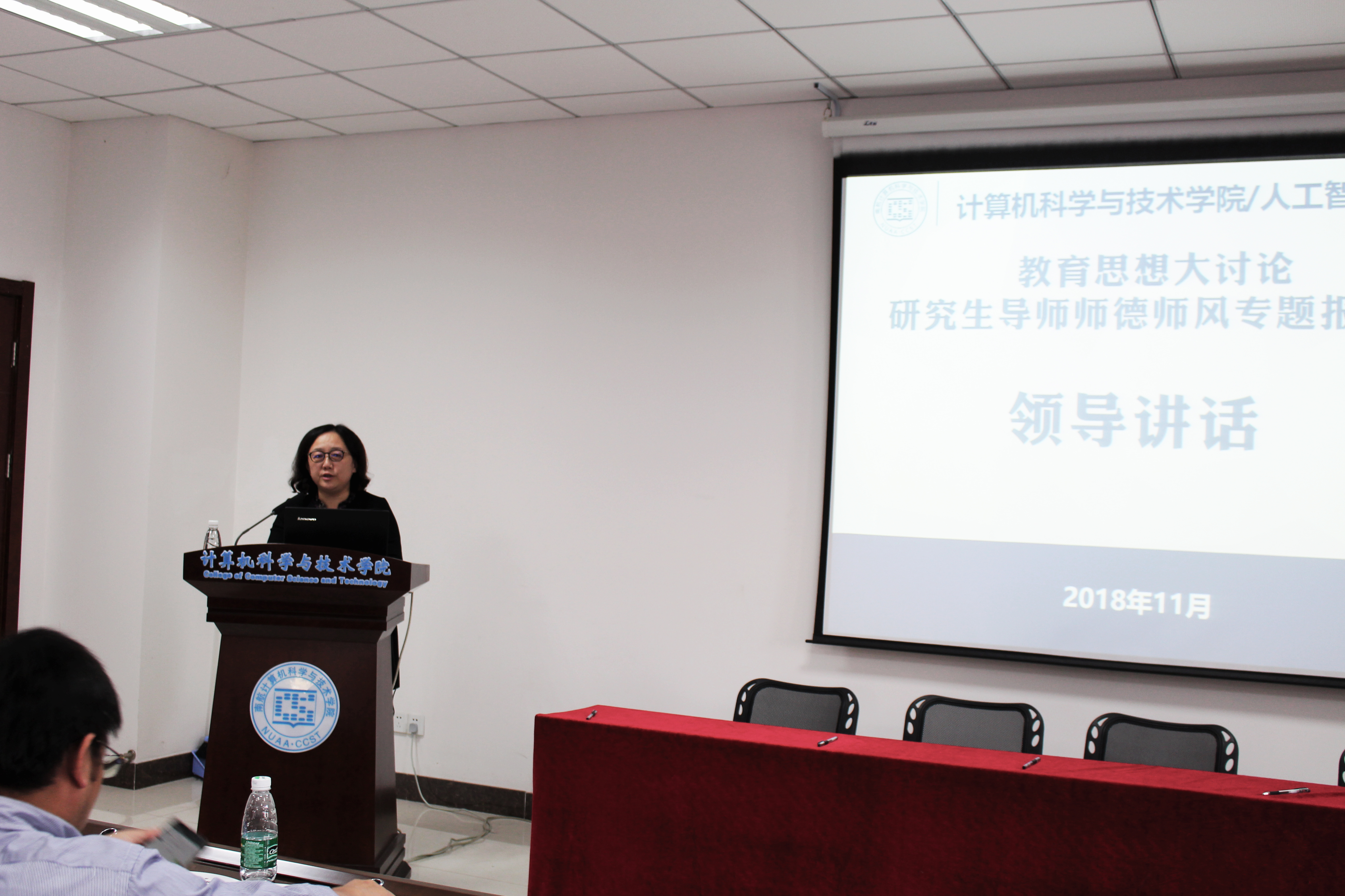 最后,学院党委书记刘健荣作总结讲话。她指出,本次报告会暨承诺书签署仪式是学院深入开展教育思想大讨论的专题活动之一,她希望研究生导师们高度重视,将承诺书中的内容学深悟透并落实到具体工作中。她结合习近平总书记在全国高校思想政治工作会议和全国教育大会上的讲话精神,要求全院教师把握好“立德树人”这一中心环节,将思想政治工作贯穿教育教学全过程,积极践行“四有”好老师标准,努力培养具有“系统能力、创新精神、国际视野”,德才兼备、全面发展的高层次专门人才,无愧于教师的神圣职责,不负所承载的时代重任。