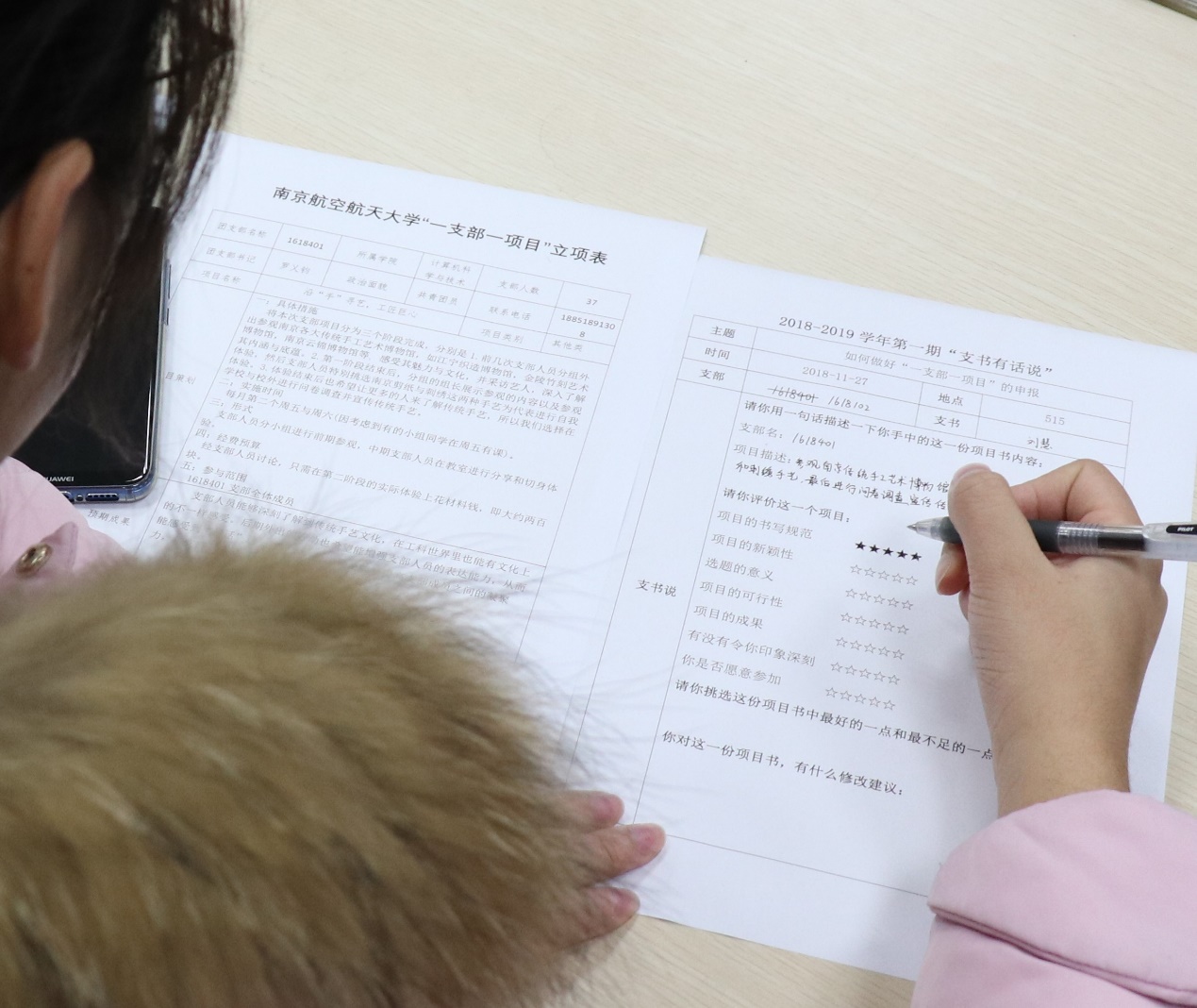 各团支提交的项目的主题丰富,包括有关注学生学习的、有献爱心做志愿者的、有探索南京传统文化与美食的、也有关于科学创造的……其中1618101团支部提出了计算机技术与生物研究的主题,很好的利用了自己的专业知识;1618203团支部则提出了开发手机APP“(We Know)微知”的想法,以便同学们了解学校各种社团组织的活动,从而达到节约大家时间的目的……各位团支书踊跃发言,纷纷说出自己的感受和想法,团委书记耿瑞老师也对所有项目都进行了一一点评。讨论结束后,各团支书将自己的项目评分表交了对应团支书的手中,以这种互相提建议的方式,大家对每一份项目申报书都进行了完善。