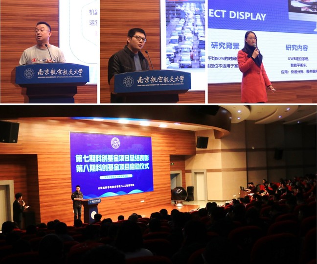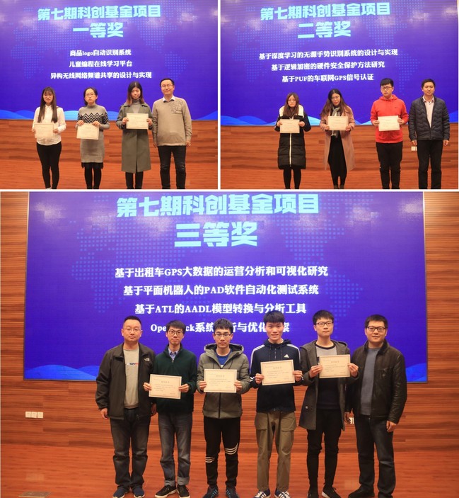 在优秀团队分享环节中,第七期科创团队的三名优秀学生代表向在场的观众展示了自己的科创项目成果,讲述了参与科创的经历,分享了参与科创的经验与感悟,鼓励同学们能够积极参与到科创实践中来。朱建军、丁琛、徐喆及葛恒志分别为在第七期科创基金项目中荣获一、二、三等奖的团队颁发了荣誉证书。