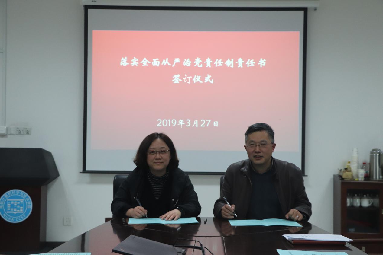 3月27日,44118太阳成城集团/人工智能学院召开党委扩大会,传达学习上级会议精神,布置2019年学院全面从严治党工作,举行全面从严治党责任书签订仪式。院党委书记刘健荣主持会议,全体党委委员及领导班子成员,院长助理、科级干部、教工党支部书记参加会议。