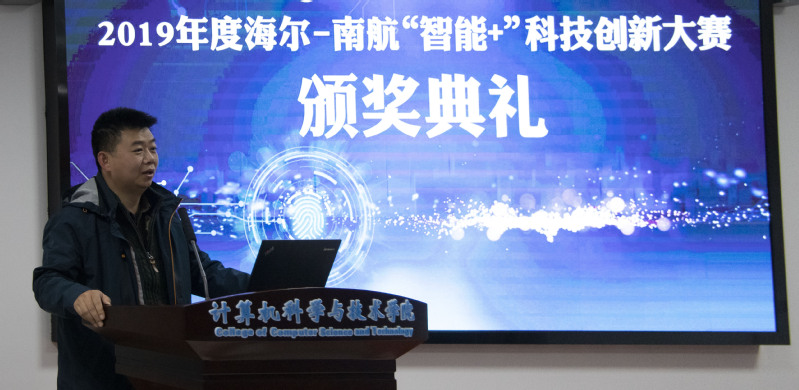 在现场答辩、评分之后,举行了颁奖典礼。在颁奖典礼中,赵蕴龙教授代表本次大赛的承办方发言,他表示,本次大赛依托海尔-南航“智能+”校企协同育人平台建设,顺应了新工科背景下人才培养的迫切需要,能够更好地助力青年学生成长,希望能够与海尔集团开展更加深入的合作。