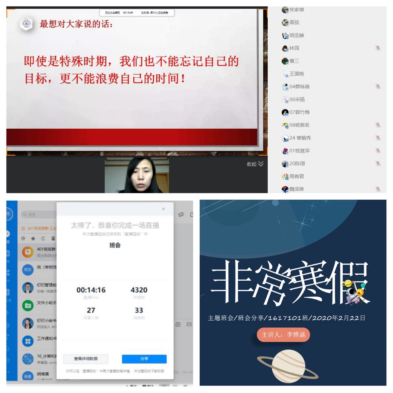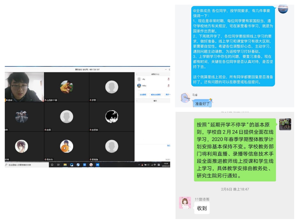 通过“云端”班会,班主任跟同学交流了学院目前“在线课堂”的准备和安排,告知同学们学院已经做好了线上教学的全面部署,也鼓励同学们需要主动与任课老师对接,积极安装和调试各种会议视频系统,配合老师一起做好线上教学的测试。相信通过班会的详细指导,同学们面对即将开始的“在线课堂”一定会更加游刃有余。