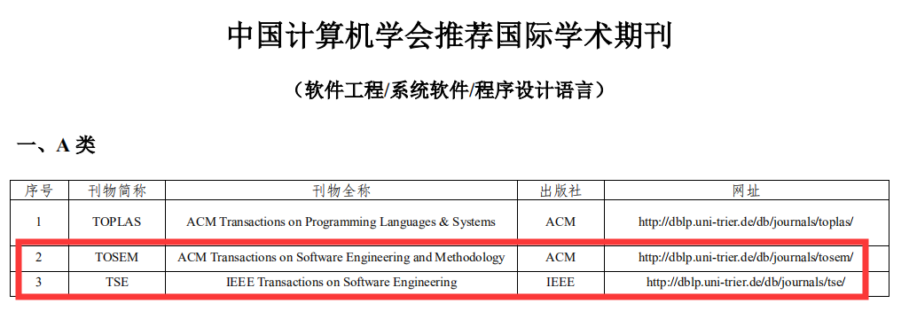 TSE全称为IEEE Transactions on Software Engineering,TOSEM全称为ACM Transactions on Software Engineering Methodology是国际公认的软件工程领域最高水平的两个学术期刊(CCF A类期刊),遵循严格的同行评审制度。