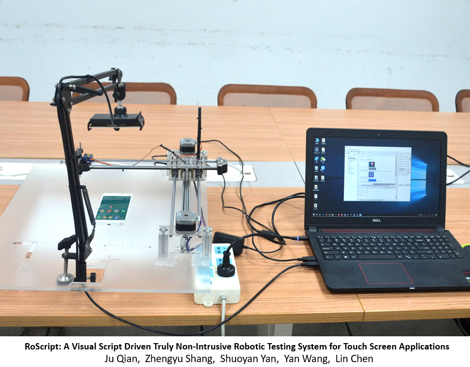论文《RoScript: A Visual Script Driven Truly Non-Intrusive Robotic Testing System for Touch Screen Applications》从侵入式测试自动化难以应用在航空、航天等工业领域的封闭和非标准化设备上这一问题出发,融合计算机视觉和机器人前沿技术,提出了面向触屏应用的非侵入式测试自动化方法,拓展了测试自动化技术的应用范围和解决思路。该工作首先提出了一套由可视化脚本驱动、利用机器人触发动作的测试自动化引擎,实现了非侵入式的测试执行。同时,还提出了视觉识别人手在屏幕上的动作,从而自动录制测试脚本的方法,实现了非侵入式的测试脚本录制。整个方法具备全程“非侵入”的特色,可在不向被测设备安装任何软件、建立任何连接的情况下工作,能够用于任意的操作系统和GUI框架。实验结果证实所提出方法具有较高的测试执行和脚本录制准确度,具备较好的可用性。