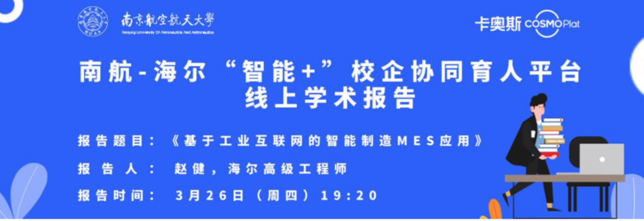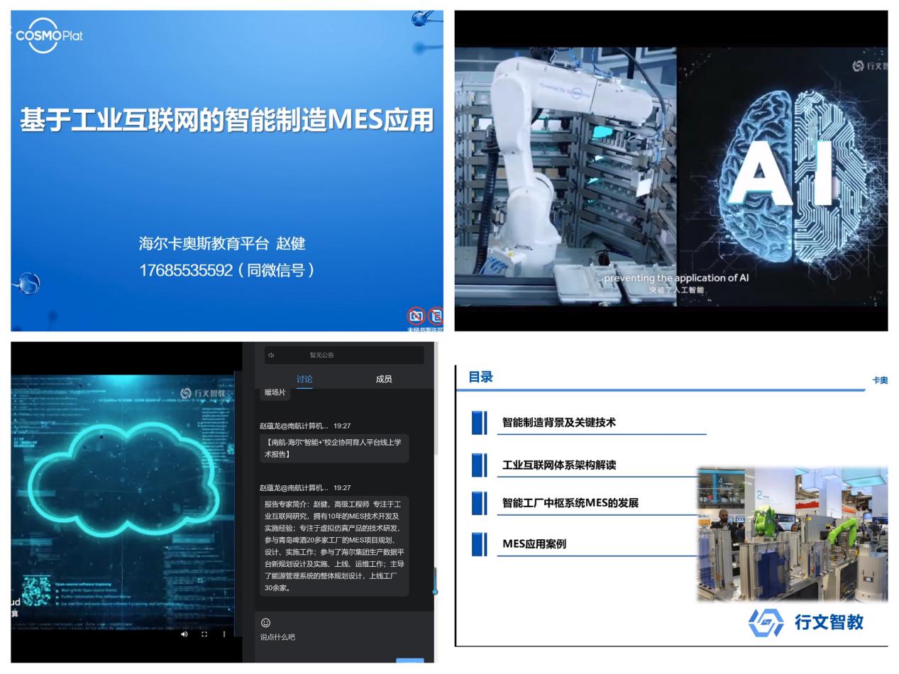 3月26日,44118太阳成城集团/人工智能学院以南航-海尔“智能+”校企协同育人平台为依托,邀请了海尔高级工程师赵健以“基于工业互联网的智能制造MES应用”为主题,开启了云端讲堂,吸引了全校师生以及部分企业技术人员共计三百余人参加。