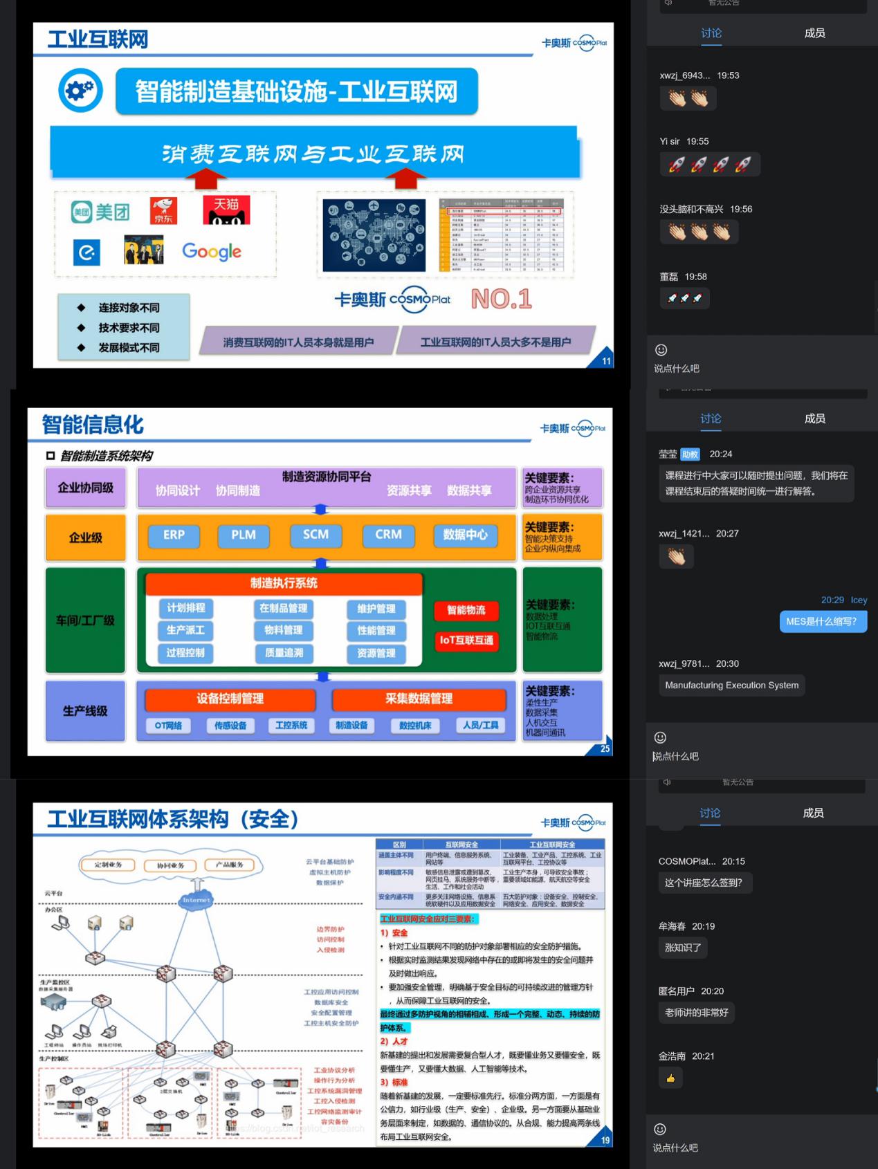 赵健高级工程师专注于工业互联网研究与虚拟仿真产品的技术研发,有着丰富的工程开发及实施经验,参与了海尔集团生产数据平台新规划设计及实施、上线、运维工作,主导了能源管理系统的整体规划设计。本次报告,赵健工程师首先从智能制造出发,突出智能制造在我国的重要地位;接着,他结合自己的工程实践经验,给同学们介绍了工业互联网及关键技术,将其与学生熟悉的消费互联网如京东、天猫等进行类比,拉近与学生的距离;最后介绍了MES系统在制造以及教学实训中的应用。报告内容丰富,深入浅出,为学生揭开了企业生产的面纱。