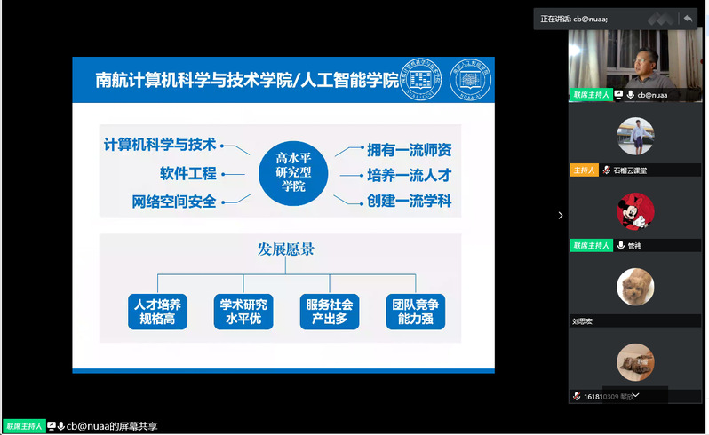 随后,学院五所一中心的教师代表就研究方向与师资力量等分别对研究所/中心的基本情况作了介绍。模式分析与智能计算研究所的袁伟伟老师以幽默的语言介绍了“可盐可甜”的模式所和“简约而不简单”的教师团队;软件研究所的周宇老师从梅宏、邬贺铨院士的“计算无处不在,软件定义一切”出发,详细介绍了软件所的研究方向和师资力量;数据管理与知识工程研究所的许建秋老师指出从事系统研究可以使编程结构化、层次化、系统化,同时培养团队合作能力;网络与信息安全研究所的方黎明老师介绍了安全所的学科基础和办学特色,号召同学们立足安全、服务国防,为航空航天科技保驾护航;网格与云计算研究所的许娟老师指出同学们要根据学习兴趣选择合适的研究方向;计算机工程技术中心主任燕雪峰老师介绍了中心的九大研究方向,同时他作为学院负责研究生教学管理的副院长,解读了学院研究生招生及培养相关政策,向优秀学子抛出了橄榄枝,并启动了2021年推免和报考学院研究生的微信咨询群。