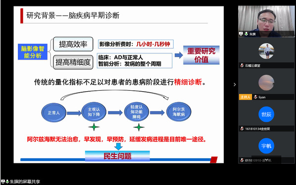 最后,朱旗作了题为《模式识别方法及在生物特征识别与脑疾病诊断中的应用》的报告,指出随着大数据的发展,机器学习和模式识别是人工智能领域最热门的研究方向,但同时也面临着许多挑战。他详细介绍了生物特征识别和脑疾病诊断等模式识别算法及其应用,针对多模态脑疾病诊断问题,设计了基于结构稀疏的多模态融合算法,在阿尔茨海默病诊断上获得了较高分类精度。他表示,相关研究正在应用到新冠肺炎与以往CAP肺炎的智能鉴别诊断上,目前已经取得了一定的识别精度,有望在未来发挥更强大的作用。