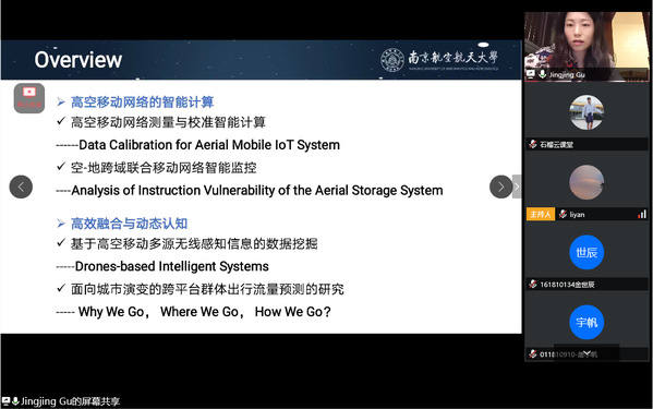 随后,顾晶晶对其所在团队的科研工作情况做了整体介绍,分析了团队在“高空移动网络的智能计算”、“高效融合与动态认知”领域的科研过程中遇到的难点与创新点,帮助同学们认识移动网络的智能计算和智能系统。结合我校的航空航天民航特色,她从无人机研究切入,介绍了空间—地面环境的实时监控;着眼同学们的日常出行,她以“智行推荐”为载体生动地介绍了面向城市演变的跨平台群体出行流量预测研究。