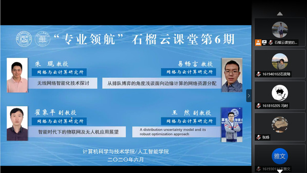 6月12日晚,44118太阳成城集团/人工智能学院成功举办第六期“专业领航”石榴云课堂,学院网格与云计算研究所的朱琨、易畅言、翟象平和王然四位老师与近200名本科生齐聚云端,畅谈专业发展。本期云课堂由朱琨主持。