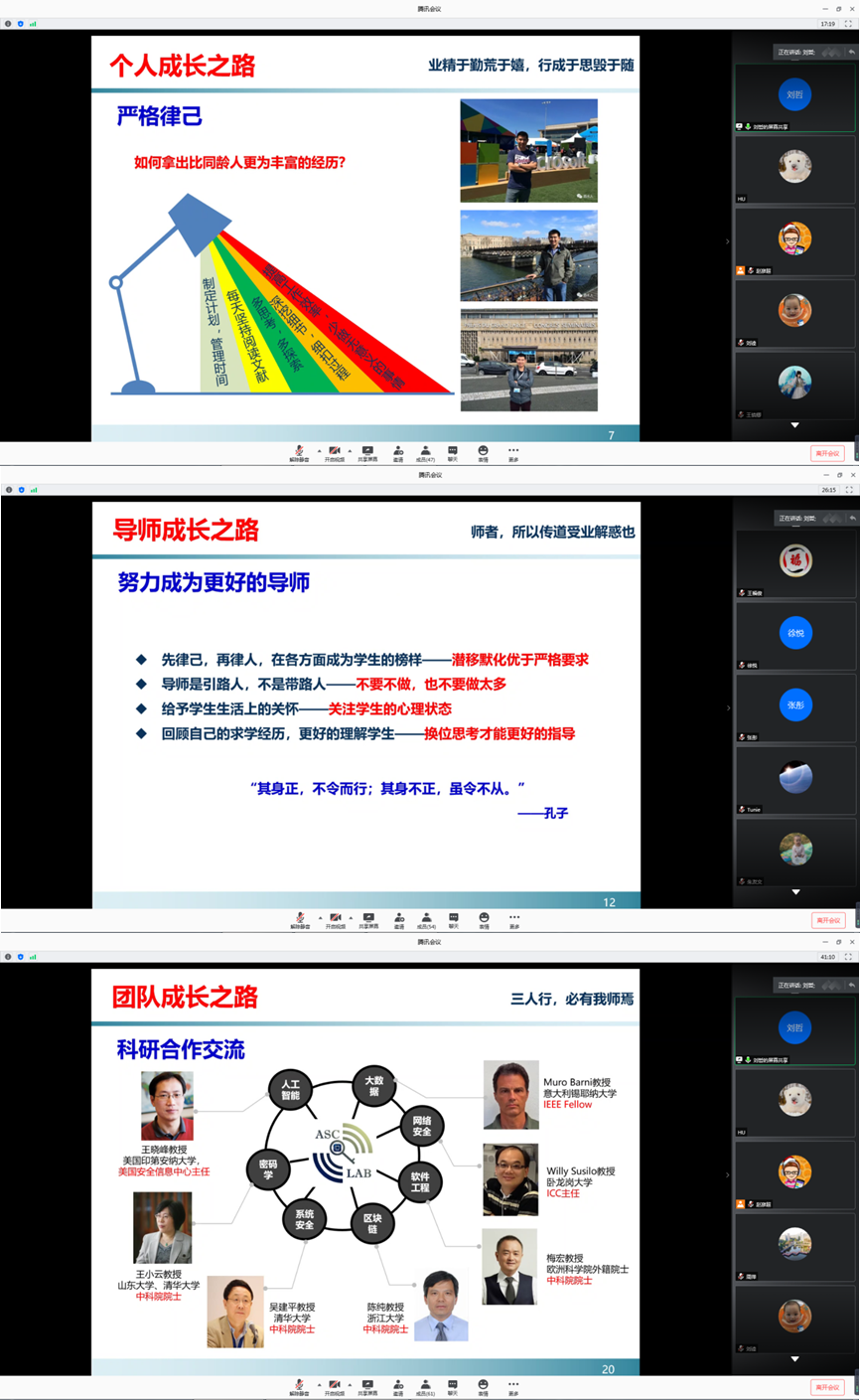 本次宣讲,刘哲从个人成长之路、导师成长之路、团队成长之路三个角度进行了交流和分享。他从求学到工作,始终坚持严格律己、主动交流、抢抓机遇,专精研究方向,不断跟进自身领域的最新成果,他提出融入主流学术圈、与关键团队建立合作是个人成长的关键,也是广大青年教师走向成功的必经之路。随后,刘哲深有感触地分享了作为研究生导师的点滴心得,一方面,他把握“定方向、做规划、供资源、严要求”四个关键点,积极引导学生主动探索,以兴趣为导向寻求创新,努力成为更好的导师;另一方面,他关注学生思想动态,重视团队文化建设,及时发现并帮助学生解决各种困难,努力成为亲密的朋友。最后,刘哲从青年教师角度切入,详细阐述了如何引领或加入一个好团队,他强调,“罗马不是一天建成的——既要持之以恒,也要快速发展”,要加强科研合作交流,不断提高团队的科研视野。目前,刘哲依托所创建的学校网络空间安全实验室,用心打造专注网络空间安全的一流团队,并与人工智能、软件工程、密码学等多领域中外知名学者形成了持续、良好的互动与合作,全力构建开放精神下的学术交流环境。