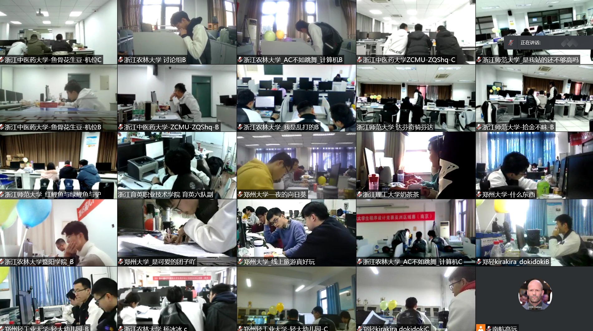 受疫情影响,为最大限度的保障参赛同学和老师的安全,避免人员流动和聚集,本次比赛依托牛客网的在线笔试平台和在线程序评测系统“云”举行。我校志愿者同学通过在线视频核实参赛同学的身份,并利用“云监控”手段对比赛过程进行监督,保障了比赛过程的顺利进行。