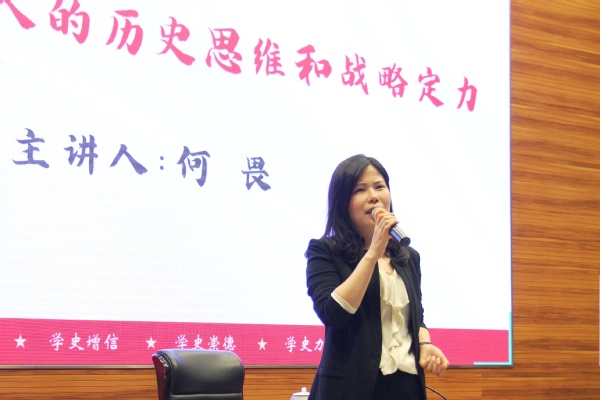 接着,她从三个方面阐述了坚持历史思维的重要性。一是,通过回顾中国共产党的诞生背景与初心使命,说明历史思维帮助中国共产党人在民族伟大复兴的历史坐标中定位初心使命;二是,通过回顾马克思主义中国化的理论创新和党与人民心连心、同呼吸、共命运的历史,说明历史思维帮助党在践行初心使命的接续奋斗中保持战略定力;三是,通过思考“中国特色社会主义要到哪里去”的问题,说明历史思维帮助党在实现共同理想的奋力拼搏中追求最高理想。