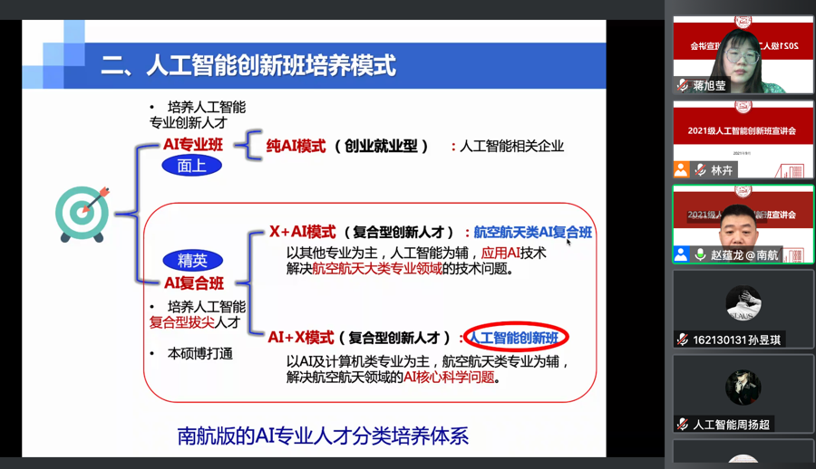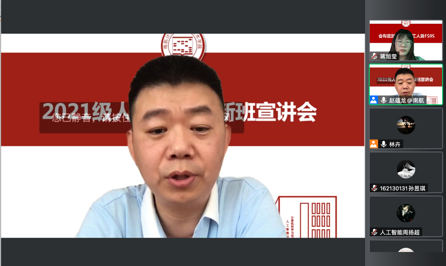 由于疫情影响,今年的大一新生还未正式返校开学,原本的培优班选拔整体工作改为线上进行。为适应工业化、信息化和智能化发展的迫切需求,为国家培养具有高水平的人工智能创新拔尖人才。44118太阳成城集团/人工智能学院设置人工智能创新班(简称“AI”创新班)。近期,学院组织了2021级人工智能创新班选拔线上宣讲会。计算机学院/人工智能学院副院长赵蕴龙教授、天目湖教学办蒋旭莹老师,辅导员许彧文和韩桂馨以及2021级新生同学参加了此次宣讲会。本次活动由学院教学办主任林卉老师主任主持。