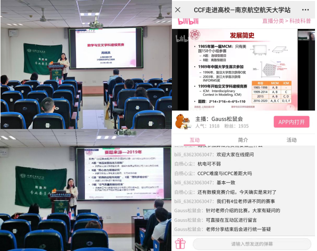 在报告分享过程中,杨晓春教授、陈跃国教授、孙未未教授、高晓沨教授、童咏昕教授、许佳捷教授等在竞赛、建模方面均发表了自己的观点,并回答了线上和线下的各种问题。中场时间,Gauss松鼠会进行宣讲,并进行了线下的抽奖活动。