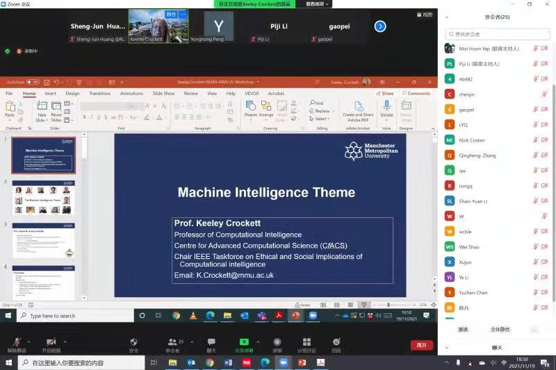 研讨会开幕式上,MMU国际合作负责人Keith Millier教授、Yonghong Peng教授和黄圣君教授分别致辞。Keith Millier和Yonghong Peng教授首先欢迎来自两校的各位代表及参会人员,介绍了MMU在人工智能相关学科近年来的发展,以及此次研讨会的筹备情况,祝愿此次研讨会能切实增强两校相关领域的学术交流,推进双方的深度合作。黄圣君教授简单介绍了人工智能学院的科研情况,并回顾了两校在人工智能领域通过合作已经取得的成果,他希望通过不断交流,为双方今后展开更加广泛和实质性的合作打下基础。