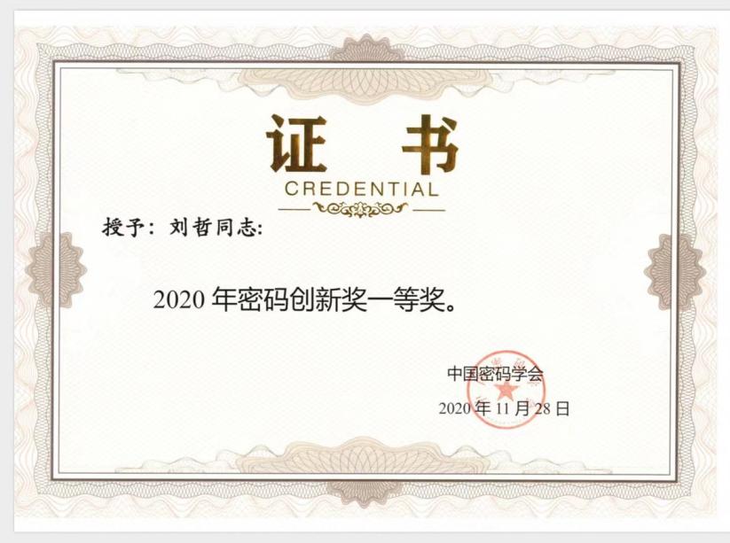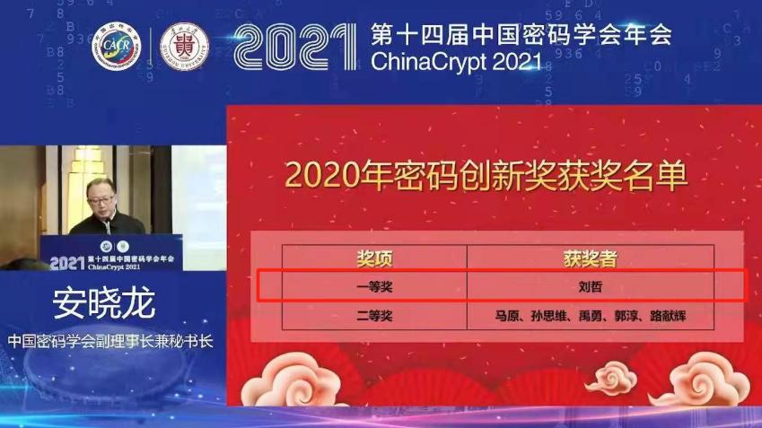 2021年12月4日,在第十四届中国密码学会年会上,学会副理事长兼秘书长安晓龙公布了2020年“密码创新奖”获奖名单,我校刘哲教授成为本年度唯一的一等奖获得者。中国密码学会“密码创新奖”每两年评选一次,每届获奖总人数不超过9名,该奖项旨在奖励在密码领域做出创造性贡献的50周岁以下的密码科技工作者,激励广大科技工作者为加强自主创新、推动我国密码科技飞速发展做出更大的贡献。