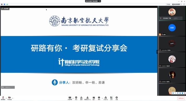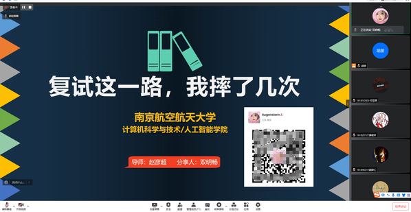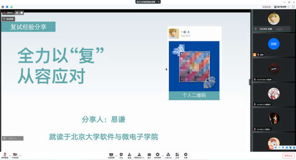 交流过程中,同学们积极参与互动,就复试准备工作提出了很多问题,学长学姐们从多种角度热情地回答了同学们的疑问,受益匪浅。最后,同学们以热烈的“云掌声”结束了本次分享会。