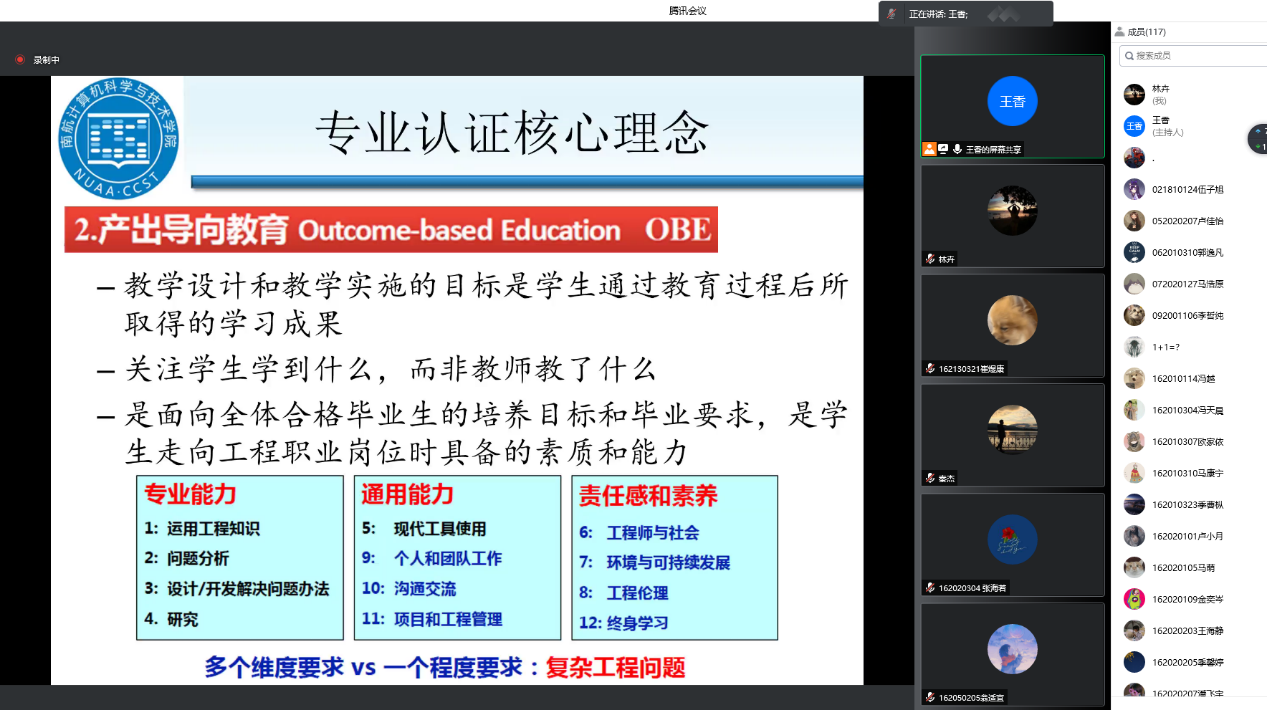 5月5日,44118太阳成城集团/人工智能学院举办青年学者午间沙龙,专题研讨工程教育专业认证,学院院长陈兵和长空学院副院长孙涵两位工程教育认证专家作主题报告。本次活动吸引了全校近50名青年教师现场参会,近120名青年教师和学生线上参会,气氛热烈。活动由院长助理、学院青联会长赵彦超老师主持。