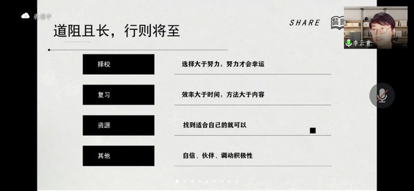 李云青分享了自己选择学校的经验,他鼓励同学们按照自己的实际情况报考学校;在考研复习中要注重效率、讲究方法、勤做笔记。他建议大家坚定自己的想法,但行好事,莫问前程。