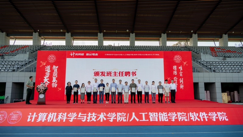 王宁宣读了计算机学院2022级本科生班主任名单,新生班主任依次发言,寄语新生,鼓励大家在日后的学习生活中不畏挑战,勤于思考。刘健荣、陈兵为2022级本科生班主任老师颁发聘书。
