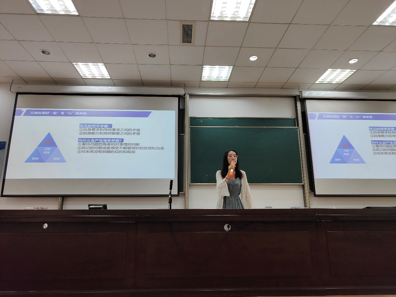 本次大会主要围绕人际关系、能力提升、高效科研三个方面展开。首先是人际关系,刘译善提到正确处理好“我”与“ta”的关系在研究生生活中占据重要地位,通过讲解身边同学的典型案例,从导师、同学、伴侣三个维度引导各位新生在研途生活中建立良性人际关系。