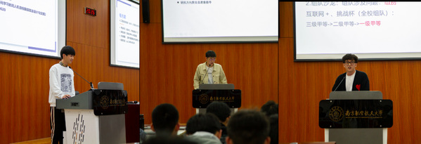 本次月讲评还邀请到2019级本科生石博文、祖元琨和钟康维为学生分享经验。石博文为大家介绍自己在大三学年参与各项科创、竞赛经历,并分享了本科期间如何主动寻找专业教师参与课题研究并最终顺利保研本校;祖元琨为大家介绍目前正在南京公司进行实习的工作经历,告知学生在大三期间该如何积累经验、丰富简历、准备实习。钟康维为大家介绍现阶段适合大三学生参加的各项竞赛与基本要求,并为学生在组队参赛、选题设计、团队分工等具体实践方面提供切实建议,引导学生积极参与创新实践,不断开拓、积累硕果。