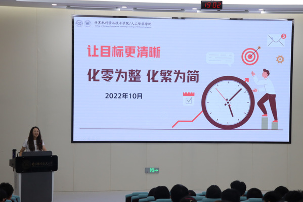 本次大会主要围绕时间管理、目标设定、职业生涯规划三个方面展开。首先是时间管理,韩桂馨带领同学们通过有关时间的互动游戏,让大家意识到碎片化时间的重要性。同时详细介绍了“四象限”时间管理方法,引导大家在未来日常学习、生活中对事情的轻重缓急进行排序,提升学习、工作效率。
