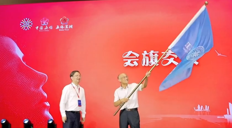 陈松灿从学会首任理事长、南京大学周志华教授手中接过会旗,他向首届理事会作出的杰出贡献表达崇高敬意和感谢,并表示学会将会团结组织广大人工智能领域科技工作者,积极开展国内人工智能领域学术交流,发现和推荐人工智能领域优秀科技人才,不断提升人工智能理论研究水平,持续为推动我省人工智能科技技术进步、提高全民科学素养、强化人工智能与实体经济深度融合贡献力量。