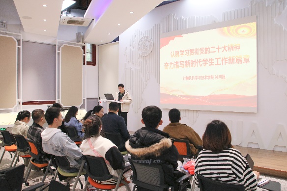随后,两学院学工团队组织了党的二十大报告联学。民航学院团委书记赵慧文、计算机学院团委书记孙明智结合党的二十大报告中关于教育的新观点、新论述,分别作了题为《伟大成就鼓舞人心,教育强国催人奋进》《认真学习贯彻党的二十大精神,奋力谱写新时代学生工作新篇章》的领学分享。大家一致表示,今后将以党的二十大精神为指引,用实际行动践行教育初心使命,争做大学生成长成才的知心人、热心人和引路人。