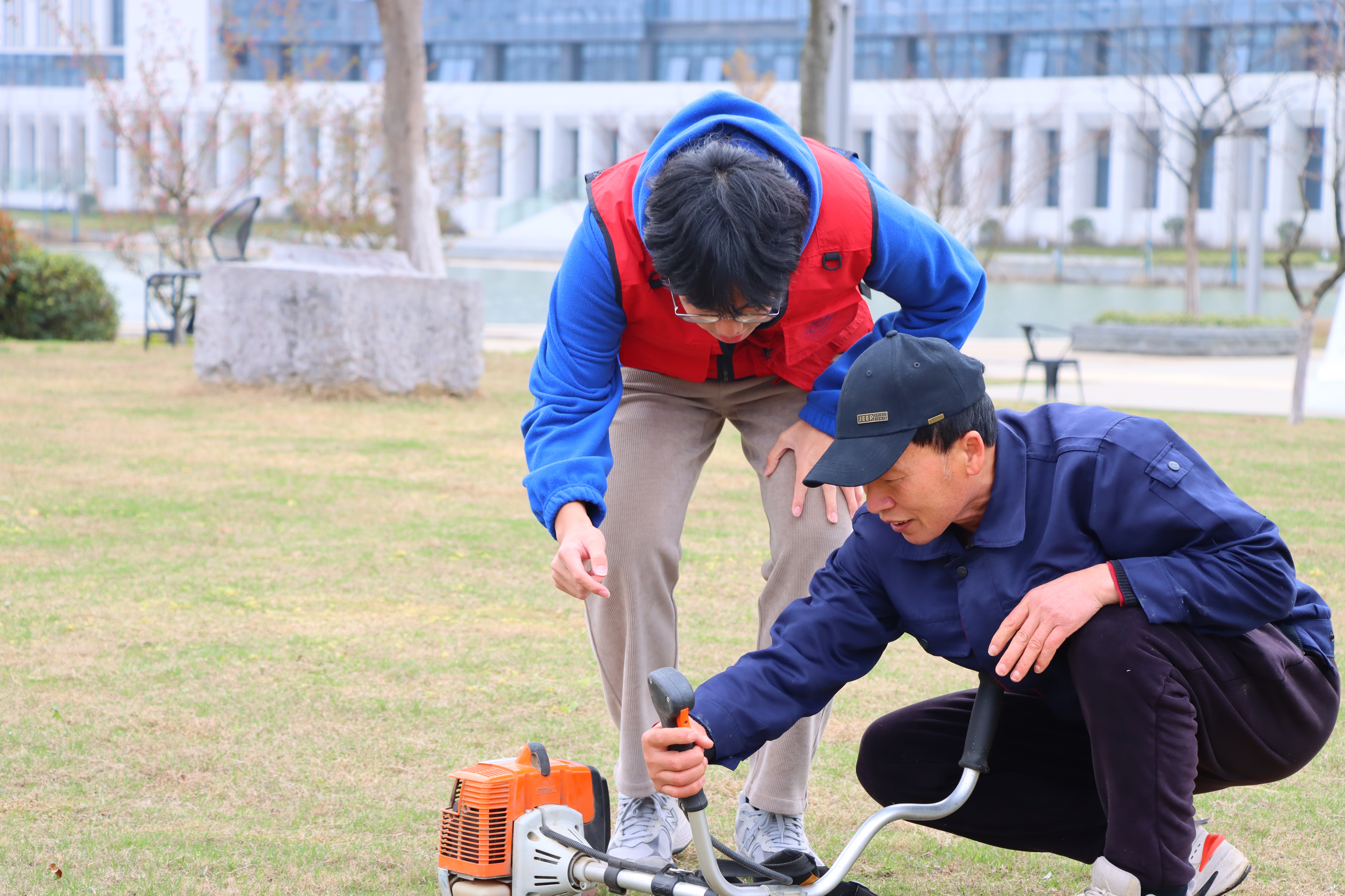 活动现场,计算机学院的同学们在校区园艺师邱金生的带领下学习了草坪机、绿篱机的操作方法,并为各类树木悬挂树牌,实现一树一“证”,为后续的管理养护奠定良好基础。