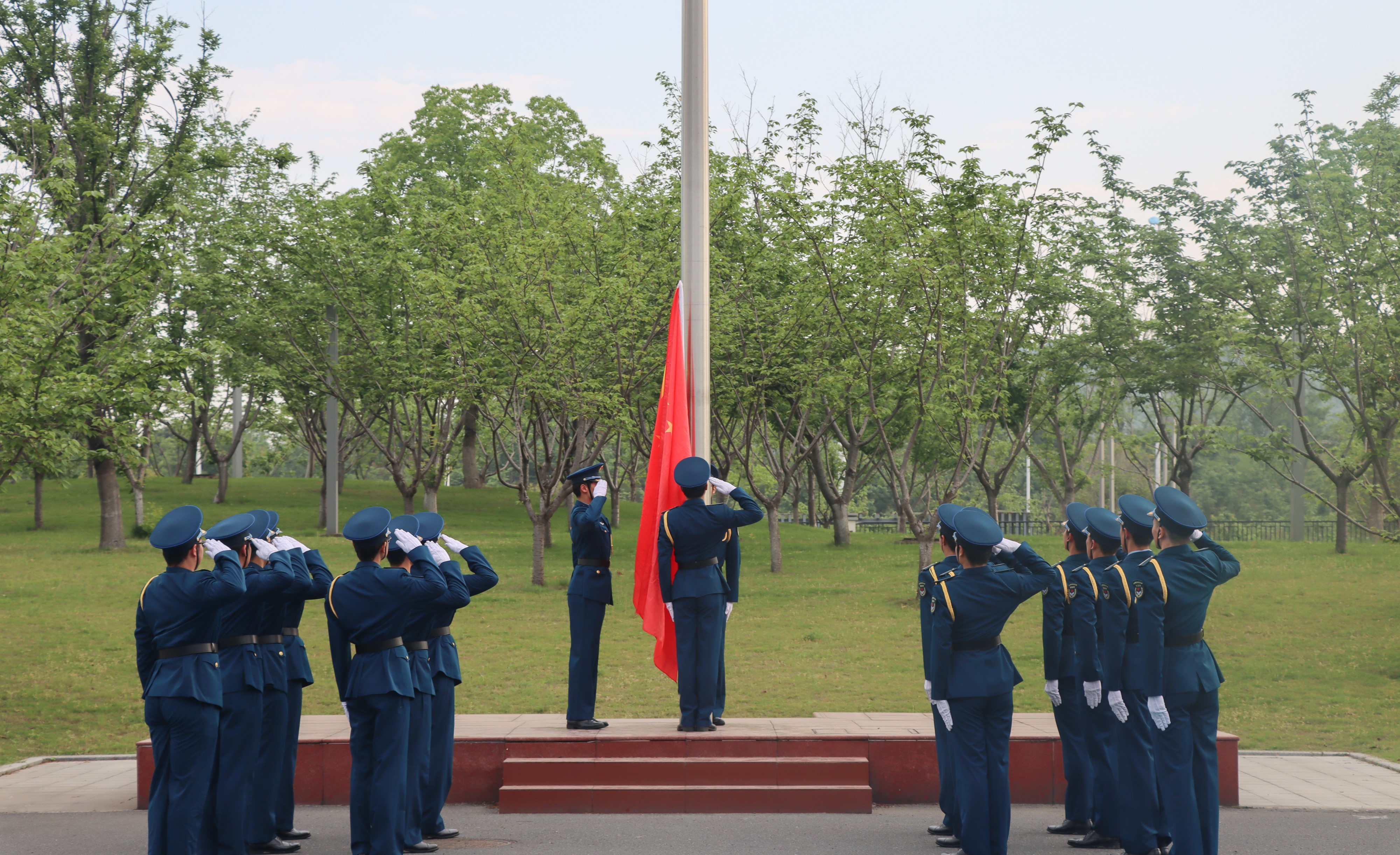在慷慨激昂的旋律中,国旗班成员护送五星红旗入场。伴随着《义勇军进行曲》,五星红旗冉冉升起,全体人员肃立,行注目礼,齐唱国歌,向国旗致以崇高的敬意。