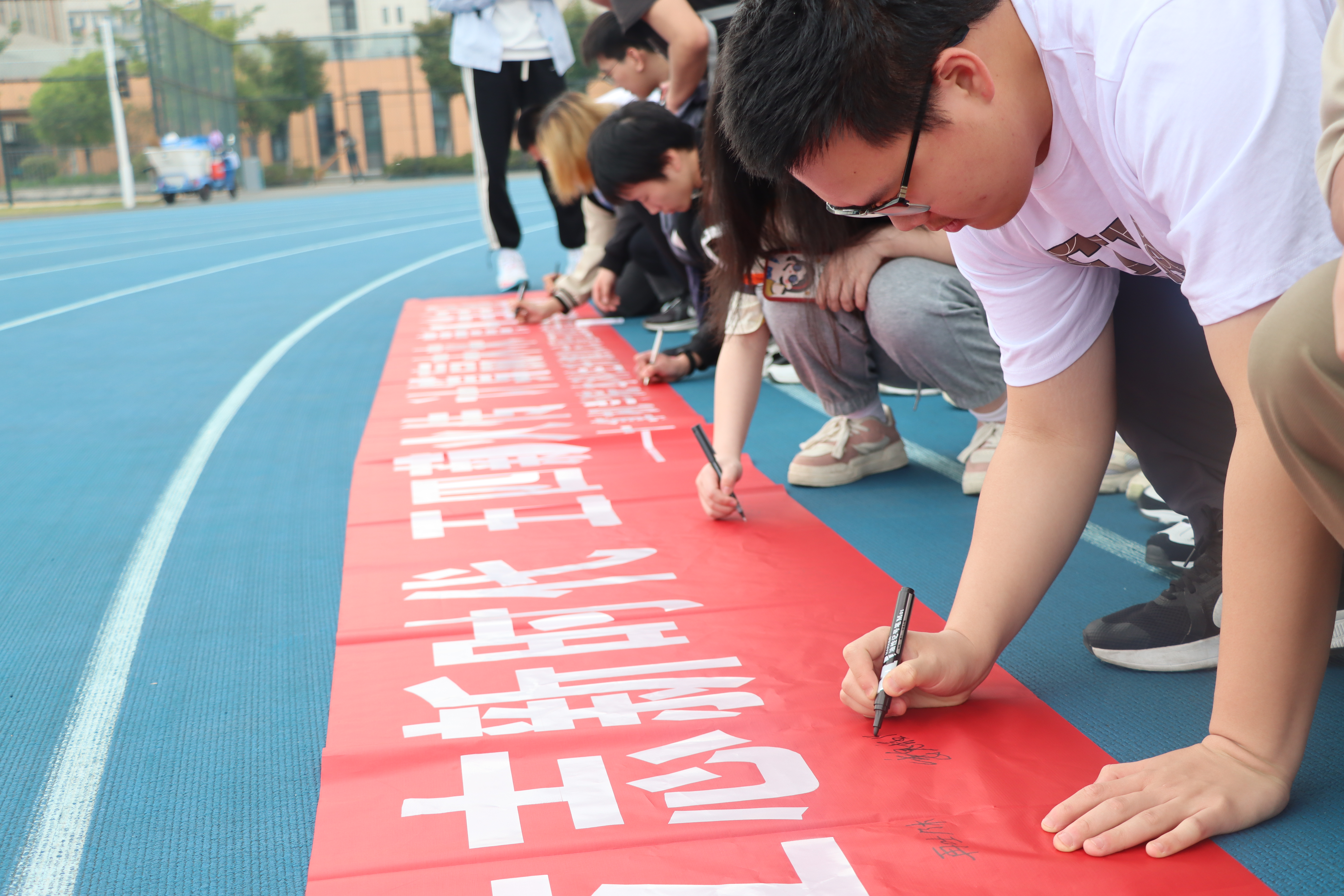 仪式最后,同学们在条幅上书写自己的青春抱负和美好理想,将对祖国深沉的爱意融刻进一笔一划的祝福之中。