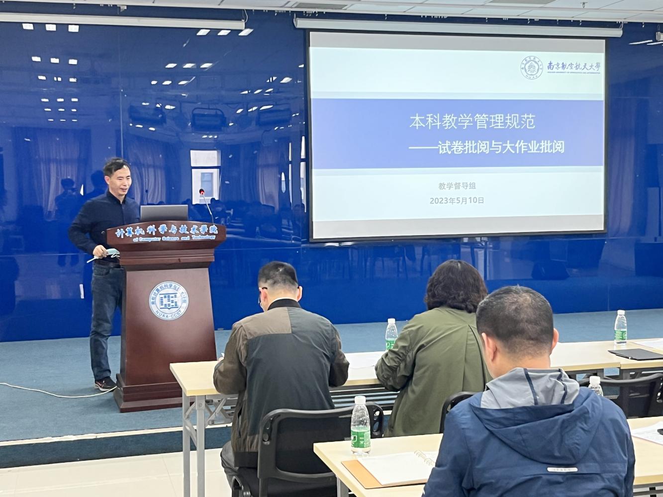 李鑫从学院下半年的重点工作出发,介绍了专业认证的核心理念、标准以及专业认证视角下的课程建设要求。他指出,人才培养工作是以学生为中心,不断优化培养方案、课程体系、师资队伍、支持条件等环节的过程。课程是人才培养最基础的环节;课程建设应围绕课程目标合理安排授课内容、进行针对性考核,持续跟踪学生学业表现,帮助学生达成课程目标,持续提升课程质量,并以此促进学生培养质量提升。