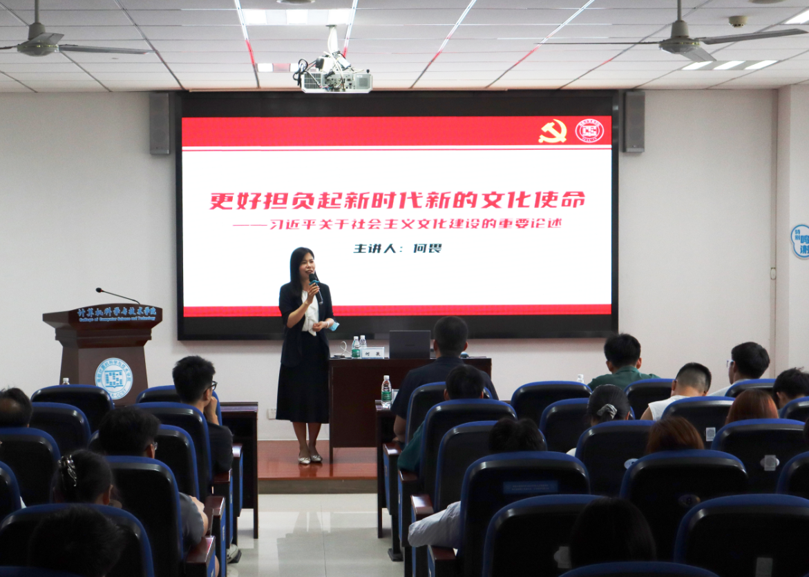 随后,何畏作《更好担负起新时代新的文化使命——习近平关于社会主义文化建设的重要论述》专题报告。首先,她结合主题教育的要求,以习近平在文化传承发展座谈会上发表的重要讲话为切入点,围绕习近平关于社会主义文化建设的重要论述,引出报告主题。接着,她从习近平关于文化建设重要论述提出的时代背景、习近平关于文化建设重要论述的主要内容、习近平关于文化建设重要论述的战略意义等三个方面进一步阐述如何更好担负起新时代新的文化使命。何畏强调,要更好担负起新时代新的文化使命,就要坚定文化自信,坚持走自己的路,立足中华民族伟大历史实践和当代实践,用中国道理总结好中国经验,把中国经验提升为中国理论,实现精神上的独立自主,为民族复兴立根铸魂,不断增强实现中华民族伟大复兴的精神力量。