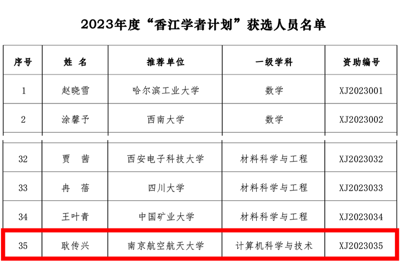 近日,全国博士后管委会办公室公示了2023年度“香江学者计划”入选名单,计算机学院耿传兴老师成功入选,是suncitygroup太阳集团两位入选者之一。