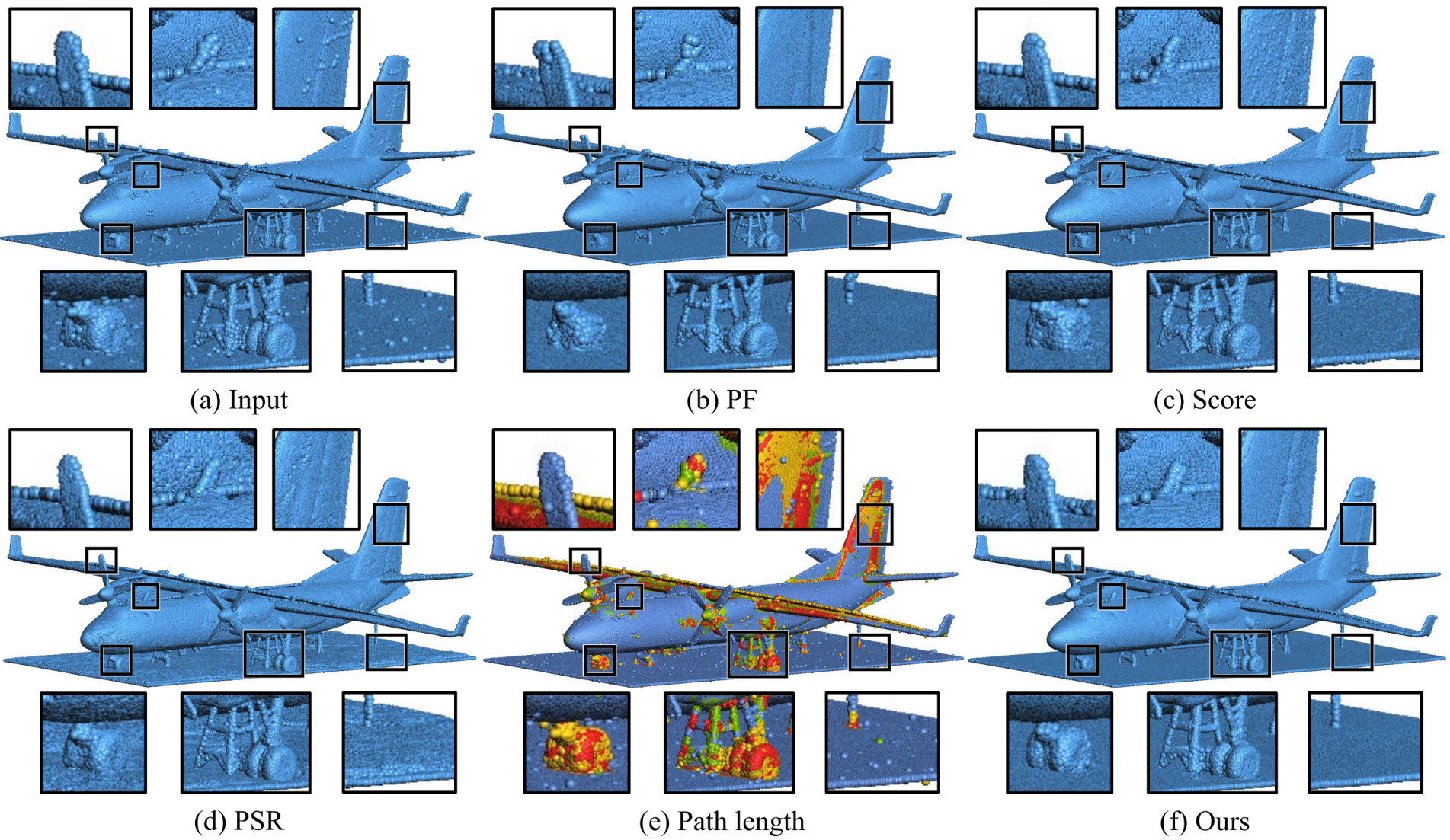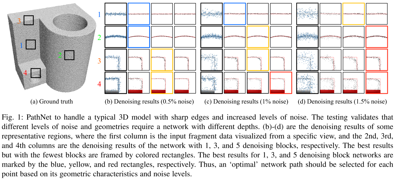 论文提出了一种基于几何强化学习的网络路径选择方法PathNet。传统学习方法往往对单个网络进行优化,使其模型参数适应于点云中每个三维点(3D Point)。PathNet使用能够感知三维几何信息的强化学习Agent,为每个三维点动态选择最合适的网络路径。该成果已应用在保持特征的三维点云去噪任务中,取得了SOTA结果。