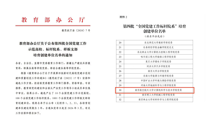 近日,教育部公布第四批新时代高校党建示范创建和质量创优工作遴选结果,学院党委入选第四批“全国党建工作标杆院系”培育创建单位(全国100个),这是学院党委继2022年入选首批江苏省党建工作标杆院系培育创建单位和模式分析与智能计算研究所党支部2019年入选第二批“全国党建工作样板支部”培育创建单位后,学院党建工作取得的又一里程碑式突破。