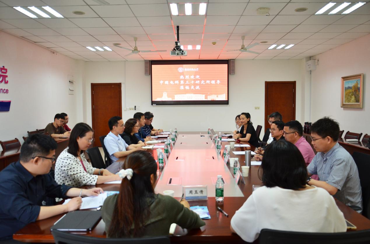 5月21日,中国电科集团首席专家、第三十研究所(以下简称三十所)研究员徐兵杰、三十所人力资源部主任廖婷婷一行5人来我院调研交流。计算机学院党委书记刘健荣、副院长黄圣君、党委副书记王宁及相关老师参加会议。会议由黄圣君主持。
