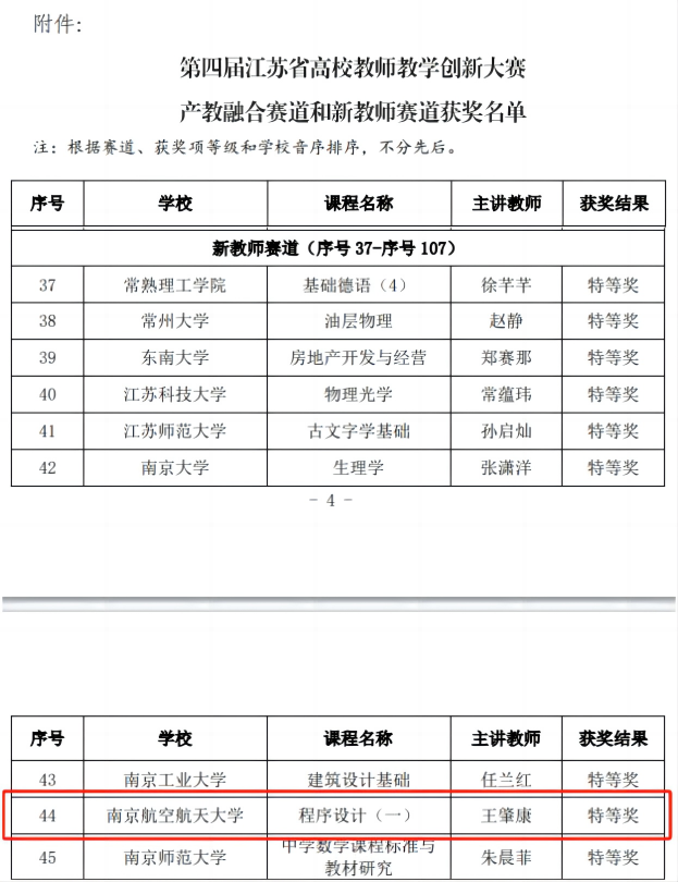 本次教学创新大赛前后历时近8个月,依托课程教学团队组建教学创新大赛团队,既发挥了团队协作优势又锻炼了团队青年教师。团队青年教师王肇康副教授依托“程序设计(一)”课程教学创新改革在第四届江苏省高校教师教学创新大赛新教师赛道中荣获特等奖。