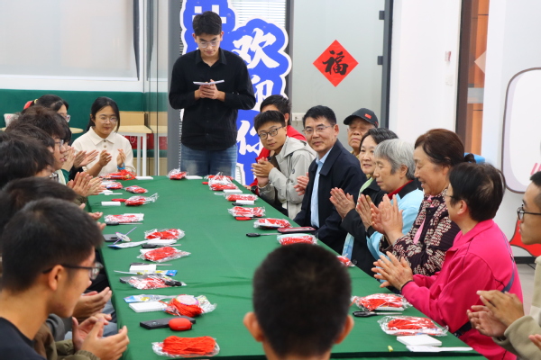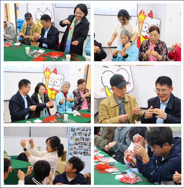 最后,退休教师们与新生们一同投入到中国结的制作中,他们精心挑选合适长度的丝线,固定一端,运用双联结、平结等编织技巧,一步步将手中的丝线编织成精美的中国结。现场氛围热烈,师生们在共同创作中加深了情感联系。