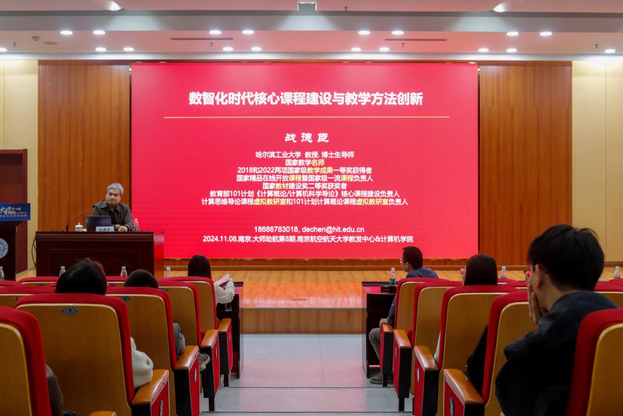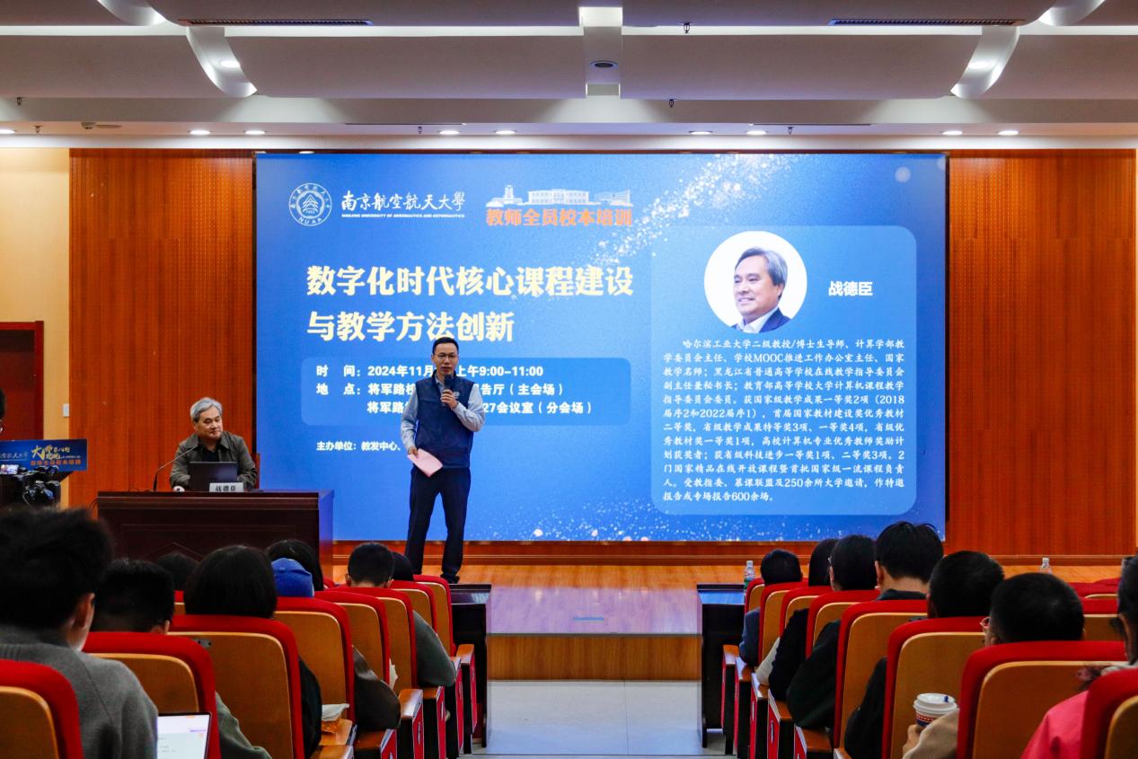 11月9日,计算机学院与教发中心联合举办学校教师全员校本培训——“大师助航”通识计划第八期报告会,哈尔滨工业大学教授、国家教学名师战德臣受邀来我校作“数字化时代核心课程建设与数学方法创新”报告。报告设图书馆报告厅主会场与1号教学楼10527报告厅分会场。本次活动由计算机学院院长黄圣君教授主持。