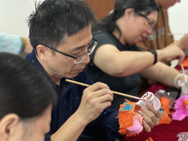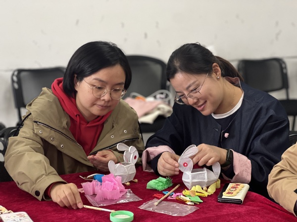 此次活动制作的是秦淮灯彩经典造型——兔子灯。在顾老师的讲解带领下,教职工们紧跟步伐,糊浆水、贴宣纸、缠细绳…循序渐进,给小兔子贴上眼睛、穿上裙子,就这样,一个个鲜艳可爱的兔子彩灯诞生了。