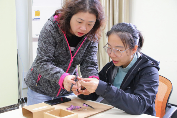 制作绒花的过程是一项精细且富有艺术性的手工艺活动,它融合了传统技艺与现代审美。这次主要体验的是打尖、传花的过程。先根据作品不同的需求,用剪刀对圆形绒条进行修剪加工,左手拇指和食指捏住绒条一端的铜丝慢慢捻转,右手握住打尖剪进行修剪,最后用镊子将打尖过的不同色彩、规格的绒条进行造型组合,随着指尖的翻飞,一朵朵绒花在教职工们的手中悄然绽放。